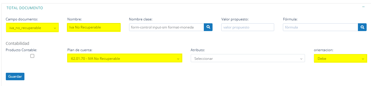 3. Después hacer clic en Total Documento, donde visualizará los campos asociados a esta sección, luego en Campo documento debe buscar el ítem iva_no_recuperable, una vez seleccionado tiene que asignar un Nombre representativo por ejemplo "IVA No Recuperable", elegir la cuenta contable que corresponda y si la cuenta maneja atributo indicarlo en la columna que está al lado, la orientación aquí se asigna el sentido en donde se centralizará el monto correspondiente al campo elegido, para este caso debe elegir al Debe y por último para finalizar hacer clic en Guardar.