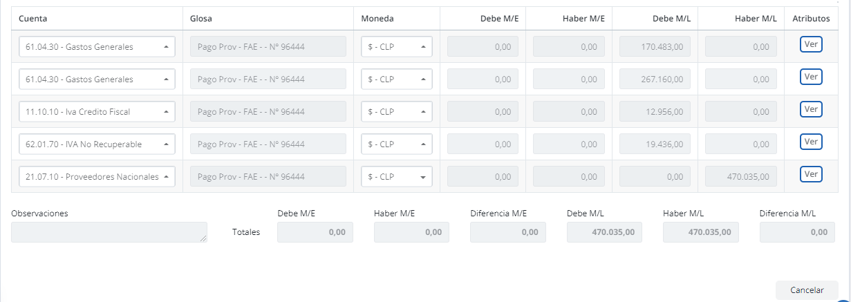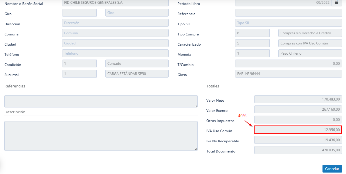 Reseña: El documento se visualizará de la siguiente manera con un porcentaje del 40% en IVA de uso común, y el restante en IVA no recuperable.