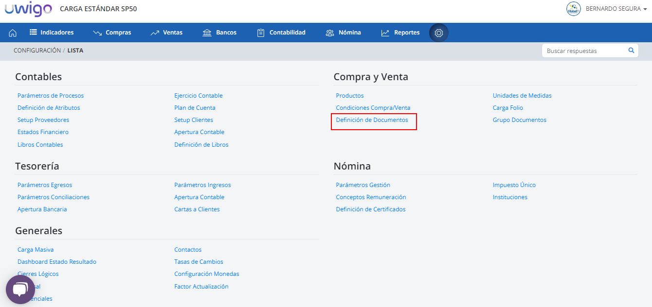 1. Una vez seleccionada la empresa presione "Configuraciones" del menú principal, luego haga clic en Definición de Documentos de la sección Compra y Venta.