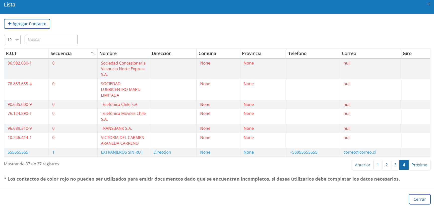 Recordar que al elegir un contacto debe estar en color azul, los que estén en color rojo debe de completar los datos correspondientes para ser utilizados en la creación del documento manual y para eso solo debe hacer clic en el contacto en rojo y se redireccionara para completar los datos necesarios.
