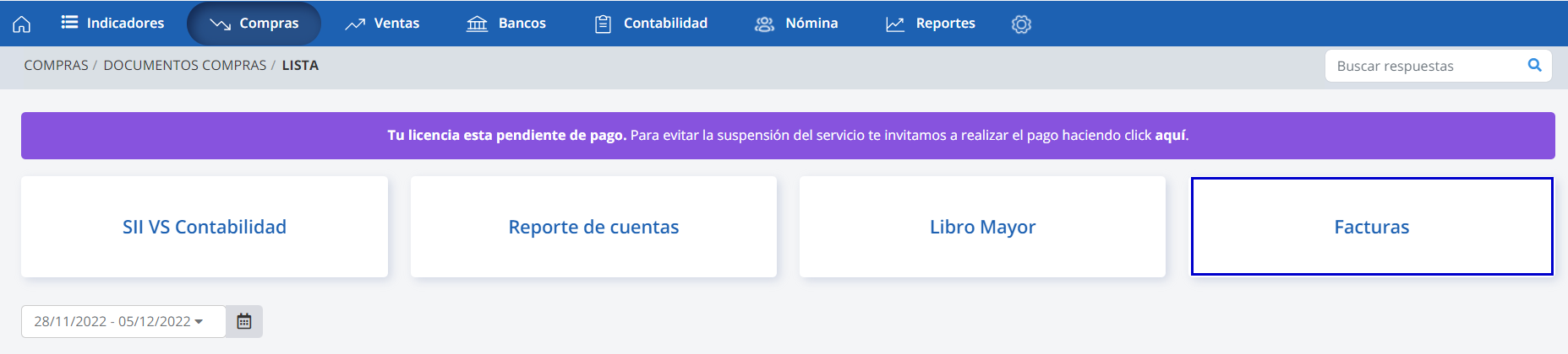 1. Una vez seleccionada la Empresa haga clic en Compras del menú principal, luego haga clic en el botón de Facturas.