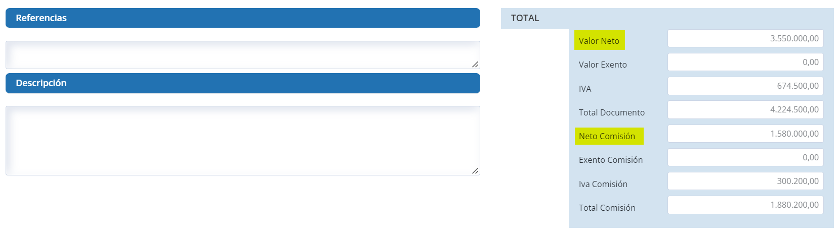 Luego debe digitar el Valor Neto y al tabular se realizará el cálculo automáticamente del IVA y Total Documento. Después lo mismo para el Neto Comisión.