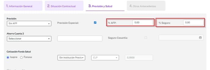 En la sección de Previsión y Salud, se debe marcar el check de Previsión Especial, asignando 0 tanto a %AFP y %Seg.