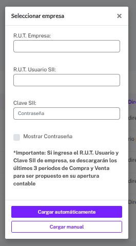 En caso de NO disponer de la clave del SII puede continuar creando en forma manual la Empresa, presione el botón "Cargar Manual".