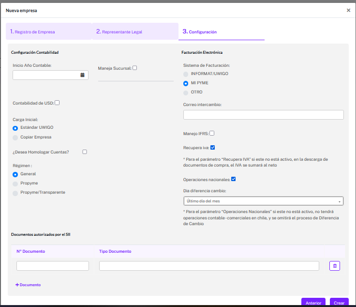 4. Ingrese los datos finales de la configuración tales como: Inicio Año Contable, el sistema de facturación electrónico utilizado y los documentos electrónicos autorizados por el Servicio para el contribuyente individualizado.