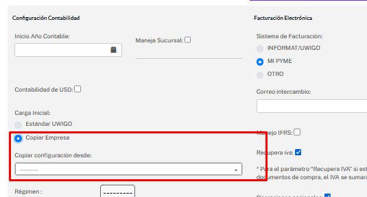 La opción "Copiar configuración desde" permite al usuario copiar toda la parametrización desde una Empresa que ya exista en Uwigo, evitando tener que volver a crear la misma configuración.