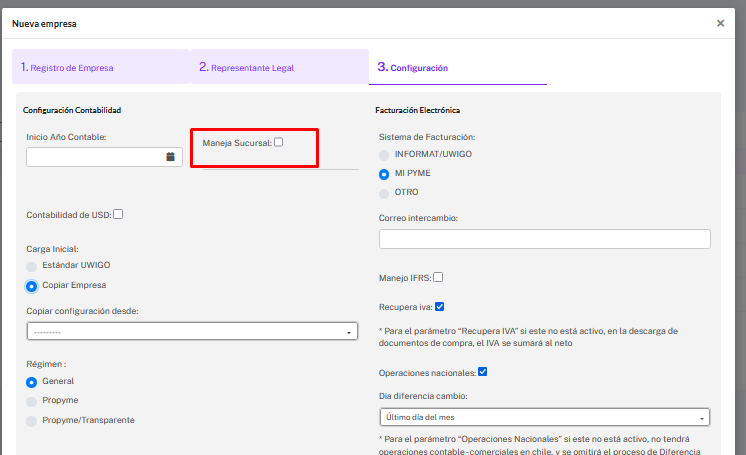 Se incorporó en la configuración básica la opción de Carga Inicial donde puede seleccionar Estándar Uwigo, el cual trae predeterminado el plan de cuenta y la opción de homologar cuentas, también tendrá para seleccionar Copiar Empresa, el cual podrá elegir la empresa ya creada anteriormente por el usuario y copiar las configuraciones de la empresa seleccionada.