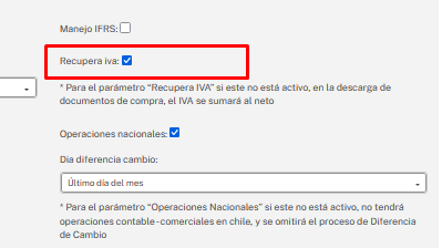 El check Recupera Iva: Para el parámetro de las empresas llamado “Recupera IVA” si éste no está activo esto aplica para empresas exentas, por lo tanto en la descarga de documentos de compra, el IVA se sumará al valor neto para el registro de su gasto. Esto aplica para empresas MiPyme.