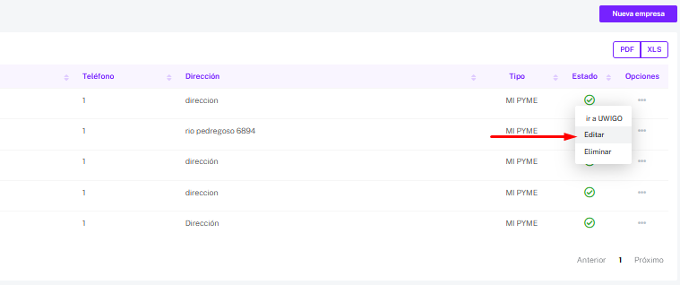 Una vez concluido el proceso de crear una Empresa podrá modificar los datos presionado el botón "Editar" el cual está ubicado en la columna "Opciones". Luego debe presionar los tres puntos y se desplegara el listado de opciones.