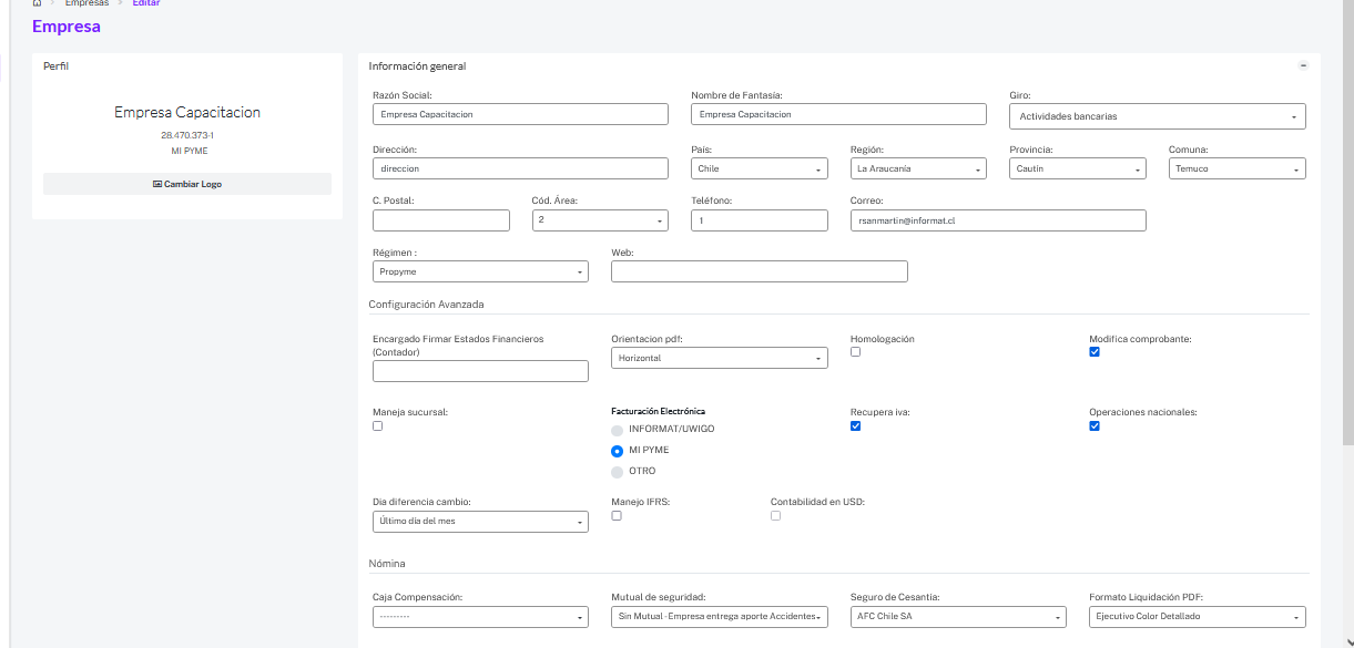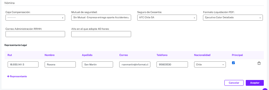 Solo en el caso de tener activo el Módulo de Nóminas también podrá modificar los datos de la Caja de Compensación, Mutual de Seguridad , Seguro de Cesantía, Formato Liquidación PDF y Correo Administración RRHH. Adicional el Representante Legal.