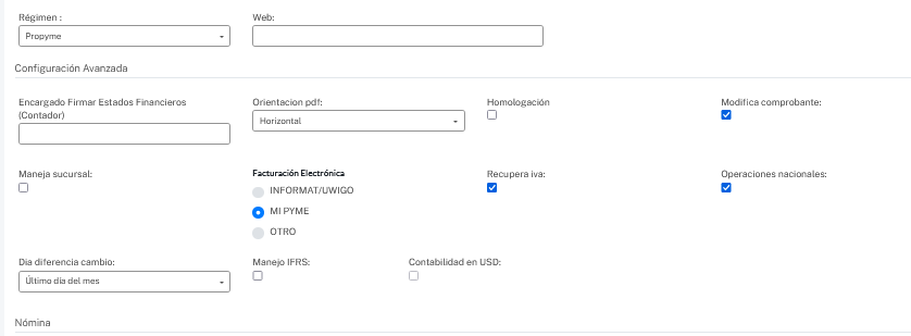 También puede parametrizar el encargado Firmar Estados Financieros (Contador),La Orientación de los reportes generados en formato PDF, Homologación, Modificar Comprobantes, Manejo de Sucursal, Facturación Electrónica (Informat/Uwigo, Mi Pyme, Otro), Recupera iva y Operaciones Nacionales.