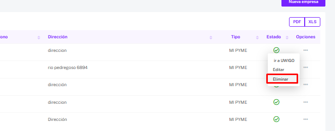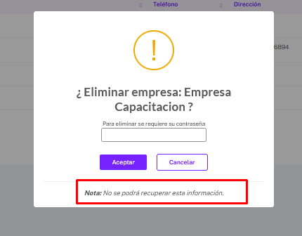 Si ha decidido dejar de utilizar una Empresa puede presionar, en la misma alternativa, utilice la opción "Eliminar", el sistema solicitará una clave de confirmación antes de proceder.
