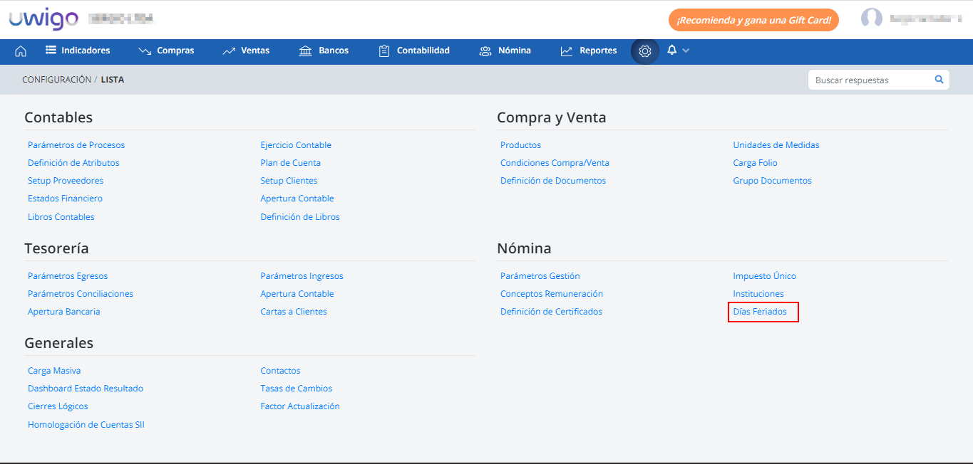 1. Una vez seleccionada la empresa hacer clic en Configuración del menú principal, luego hacer clic en Dias Feriados.