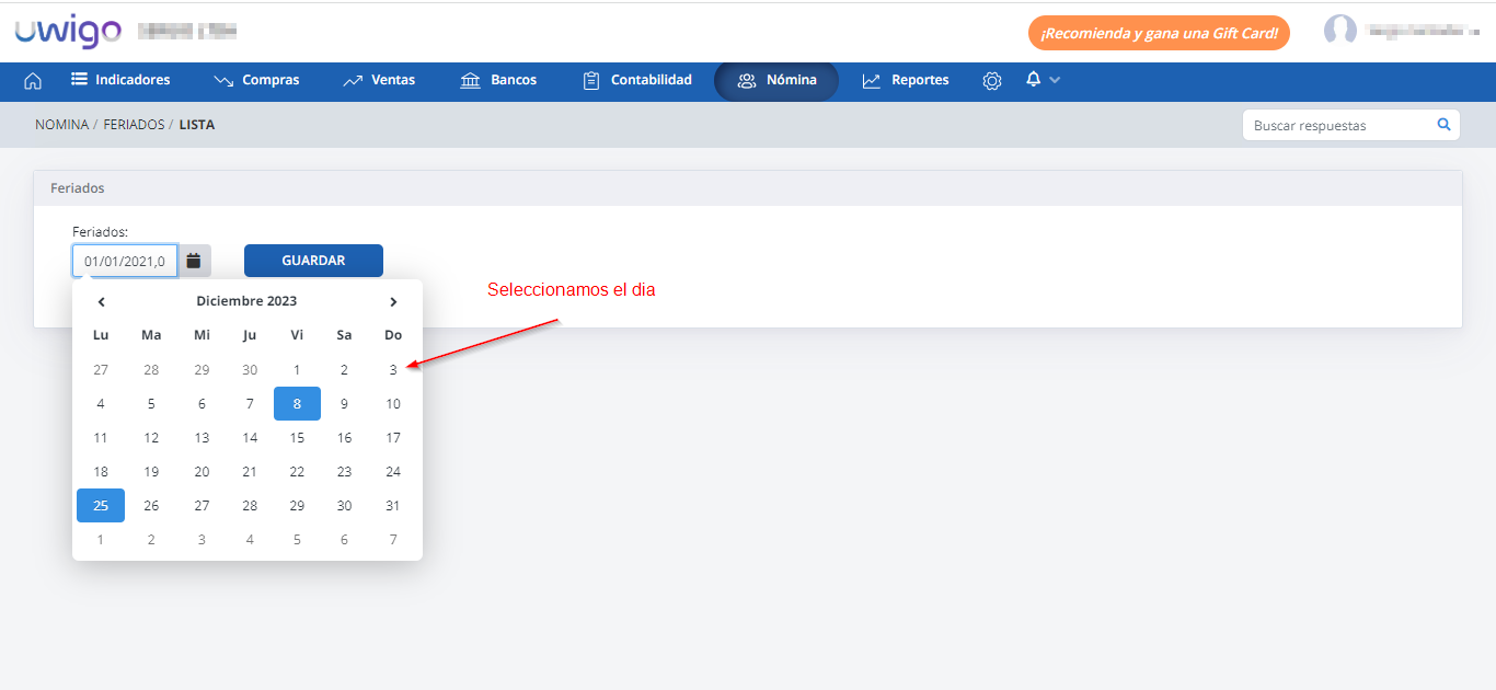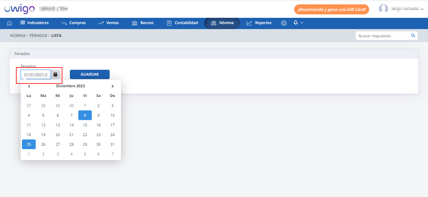 Visión General: Uwigo permite llevar el control de los días feriados del año, este nuevo control de los días feriados es utilizado únicamente en nómina.