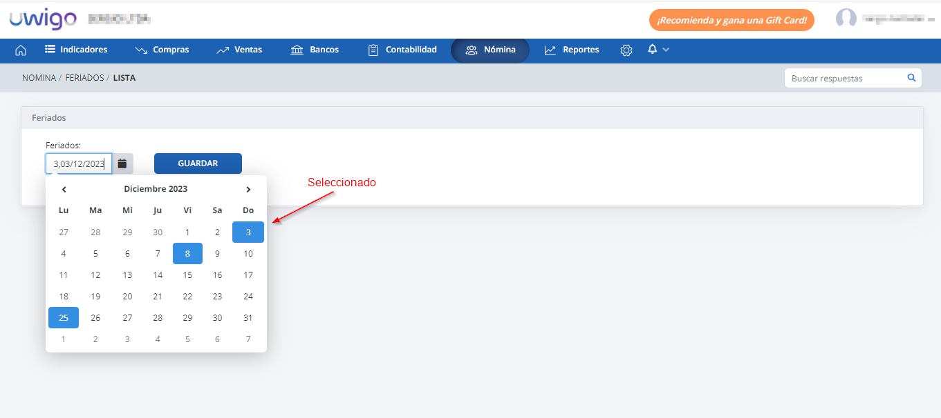 2. Visualizará un Calendario donde podrá agregar más días feriados.