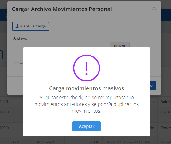 Nota Importante: El check de reemplazar datos permite que al momento de cargar los movimientos estos reemplacen a los anteriores. Si se desea agregar los movimientos y que no se reemplacen se debe quitar este check. Al quitar el check aparecerá una alerta en una ventana emergente dando información al respecto.