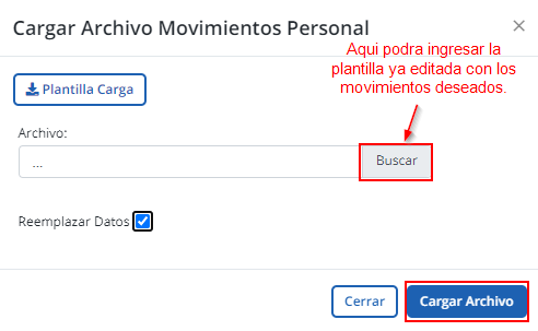 3. Se levantará una ventana correspondiente a " Cargar Archivo Movimiento Personal", en el que se debe presionar el botón de " Plantilla de Carga", para descargar la plantilla que luego se deberá subir en la misma ventana.