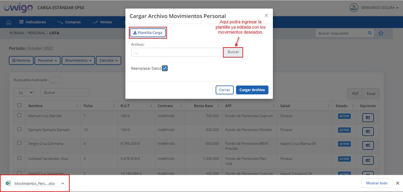 Visión General: Uwigo permite realizar carga masiva de movimiento personal, para evitar errores y ahorrar tiempo en digitación en caso de que el volumen de trabajadores sea alto.