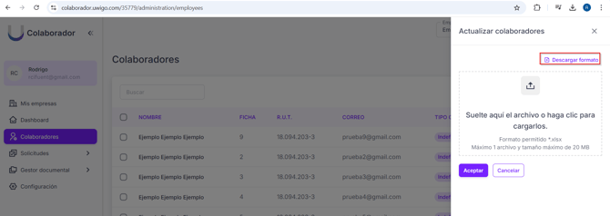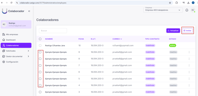 Para finalizar, presione el botón Aceptar, y podrá ver los correos institucionales con los valores obtenidos desde excel y se habilitará el check para poder seleccionar los colaboradores y poder activarlos en Uwigo Colaborador.