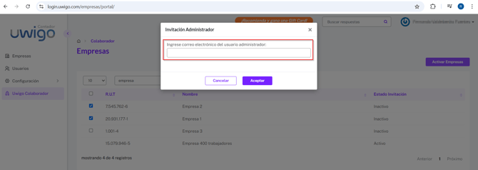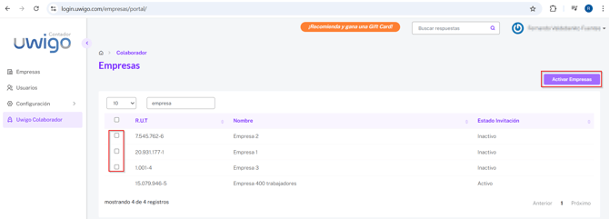 Para activar alguna empresa en Uwigo Colaborador, basta con seleccionar una o más empresas, y presionar el botón "Activar Empresas".