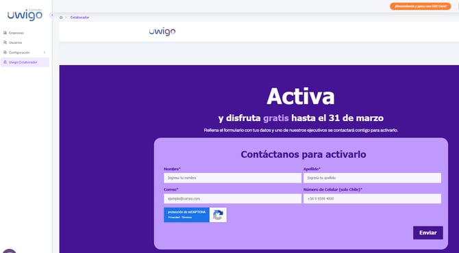 La segunda opción es completando el formulario de activación, que gatillará una tarea a nuestros ejecutivos y te contactarán para resolver las dudas y activar Uwigo Colaborador