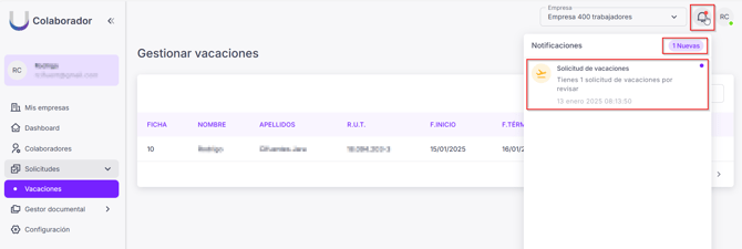 Para acceder a las solicitudes de los colaboradores en Uwigo Colaborador, el administrador recibirá una notificación cada vez que un colaborador registre una solicitud de vacaciones.