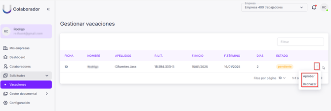 Describe como aprobar o rechazar vacaciones por parte del administrador en Uwigo Colaborador