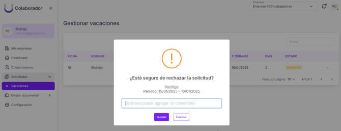 Si rechaza la solicitud, se levantará un modal de confirmación, donde se debe registrar el motivo del rechazo, para que el colaborador se entere del motivo del rechazo de su solicitud.