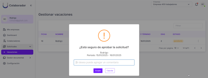 Si aprueba la solicitud, se levantará un modal de confirmación, donde puede registrar un comentario a la solicitud del colaborador.