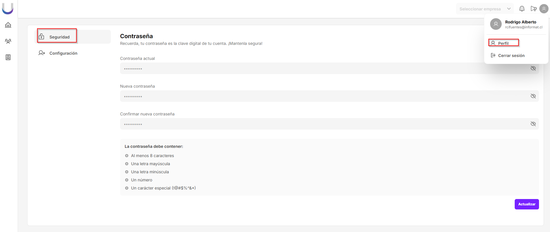 Luego debe ingresar a la opción Seguridad, y completar los campos requeridos: