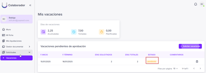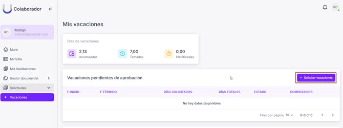 En la sección central aparecerán las vacaciones pendientes de aprobación. Es en esta sección donde se puede solicitar vacaciones, presionando el botón "Solicitar vacaciones".