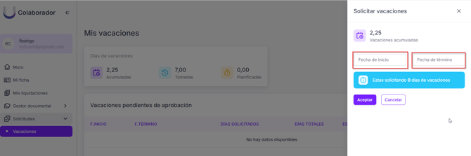 Se levantará un formulario para ingresar la solicitud de vacaciones. Debe completar la fecha de inicio y la fecha de término, y presionar el botón Aceptar