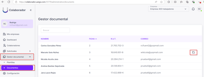 A continuación se desplegará la lista de colaboradores. Los que tengan el ícono de carpeta (ver imagen) son los colaboradores activos, y a ellos se les podrá subir documentos.