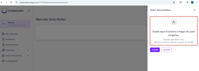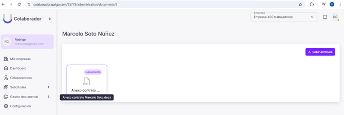 Describe como subir archivos al gestor documental en Uwigo Colaborador