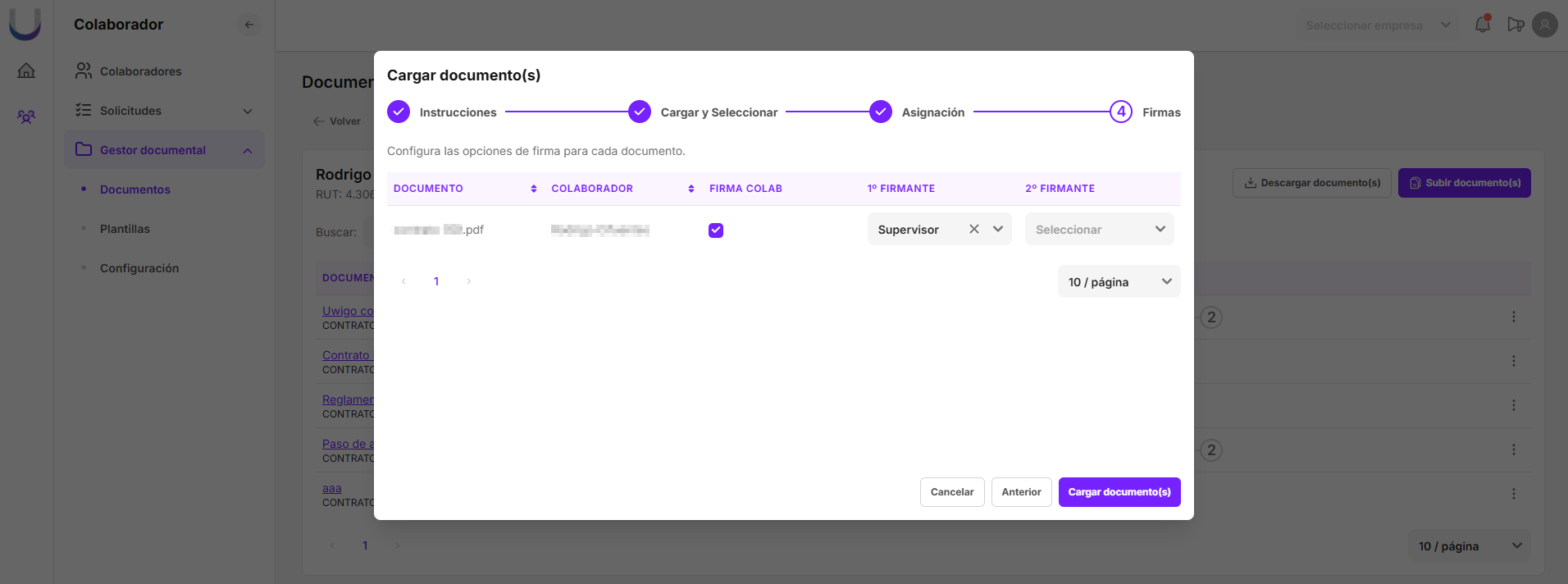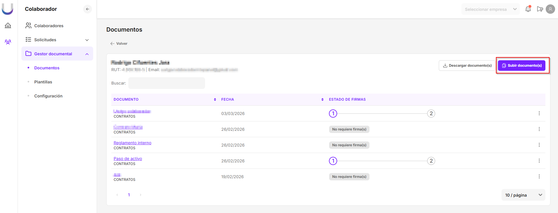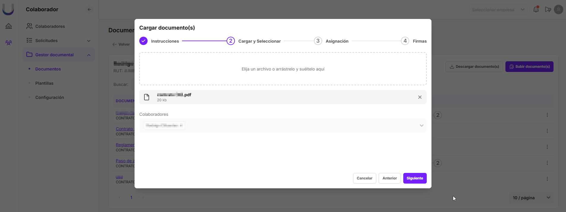 Una vez seleccionado el colaborador, se debe seleccionar el archivo a subir. Luego aparecerá en la lista de documentos