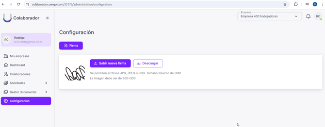 Para configurar la firma digital de la empresa, se debe acceder al menú Configuración. Una vez dentro, está la opción para subir nueva firma o descargar la firma actual