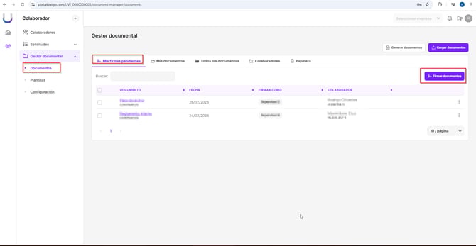 Para ver los documentos pendientes de firma, se debe acceder al menú Gestor documental -> Documentos. En la pestaña Mis firmas pendientes, aparecerán todos los documentos que el administrador del portal configuró para que requieran firmas.