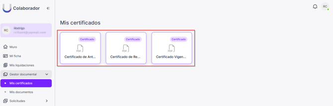 Para acceder a los certificados del colaborador, debe acceder al menú Gestor Documental -> Mis certificados.