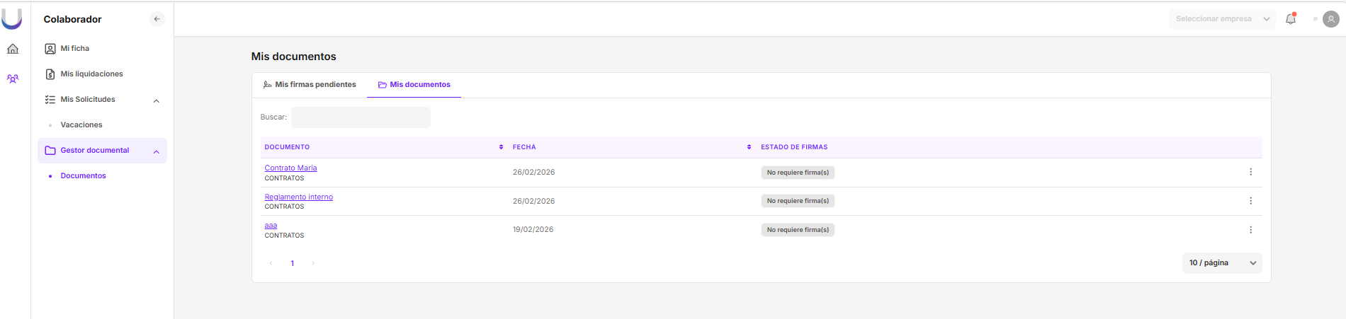 Para acceder a los documentos del colaborador, debe acceder al menú Gestor Documental -> Mis documentos.